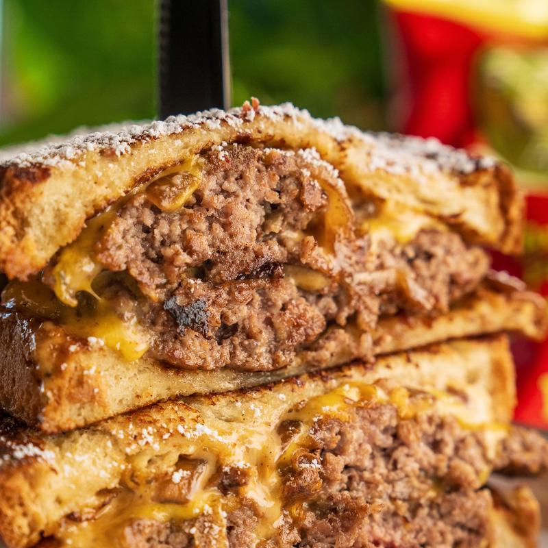 Double patty, American cheese, caramelized onions, Smackn sauce, powder sugar dust, maple