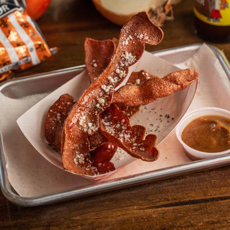 Crisp turkey bacon, romano, bourbon maple drizzle